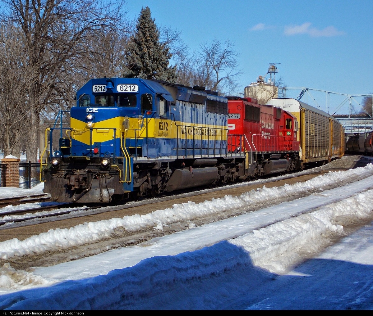 ICE SD40-2 #6212 and CP SD60 #6257 provide power to a Westbound CP Autorack train as it passes the Red Wing Amtrak depot. Photo taken 3/8/14 near MP 370.69 on the CP River Sub.