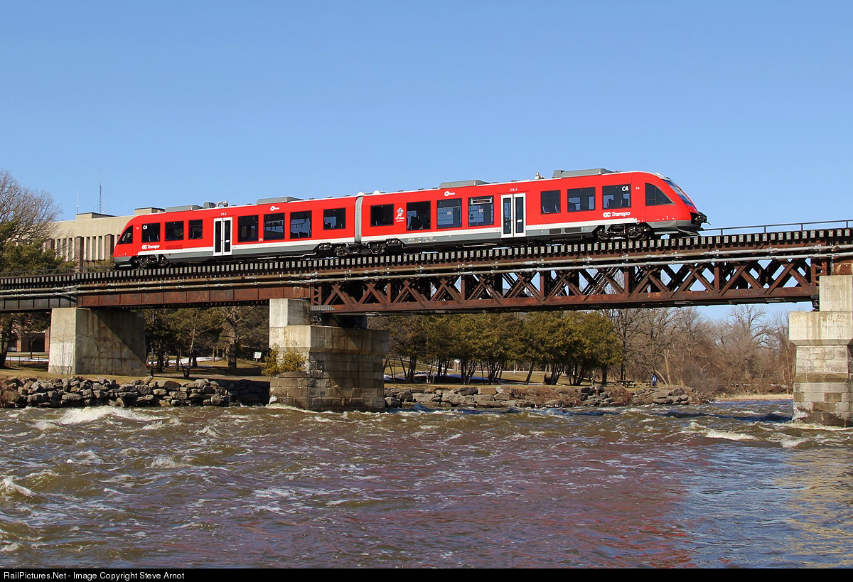 One of OC Transpo's new Alstom Coradia diesel multiple units crosses the Rideau River on the former CP Rail Ellwood subdivision. OC Transpo acquired six new two-car train sets that entered service on 2 March 2015 replacing the three Bombardier Talent BR643 sets that had been in service since the O-Train commenced operations on 15 October 2001.