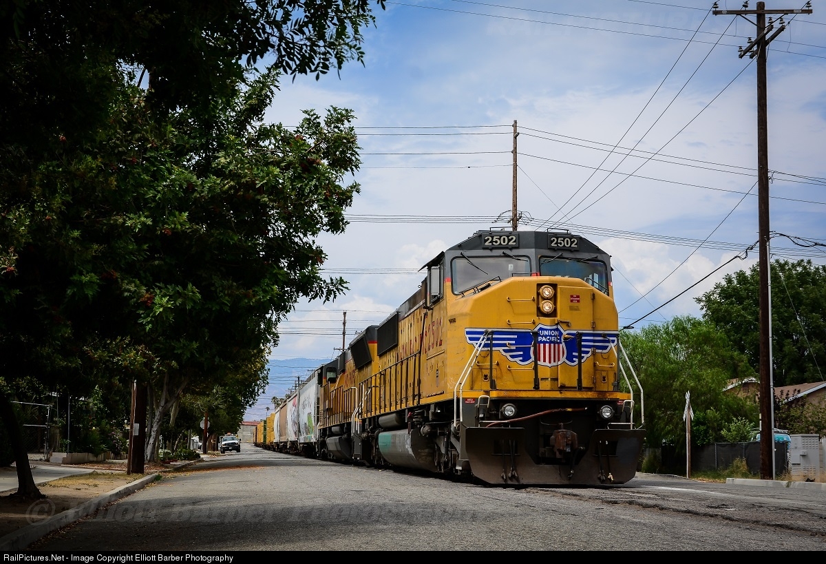 | UP 2502 and an SD59MX are in charge of the 'Old Colton Local' on a warm July day as they slowly move down 9th Street on their way to switch local industries at the end of the street. |