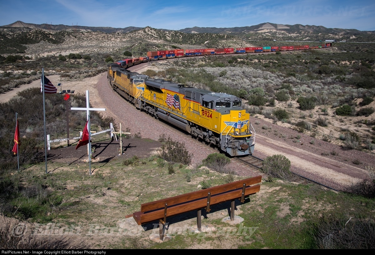 A westbound UP stack train, led by new EMD SD70AH #8924, descends Cajon Pass on Main 3. The train is passing Stein's Hill, and the memorial for two BNSF crew members that lost their lives in a derailment. This memorial is a very nice tribute, and it is well maintained. "Gone, but not forgotten."