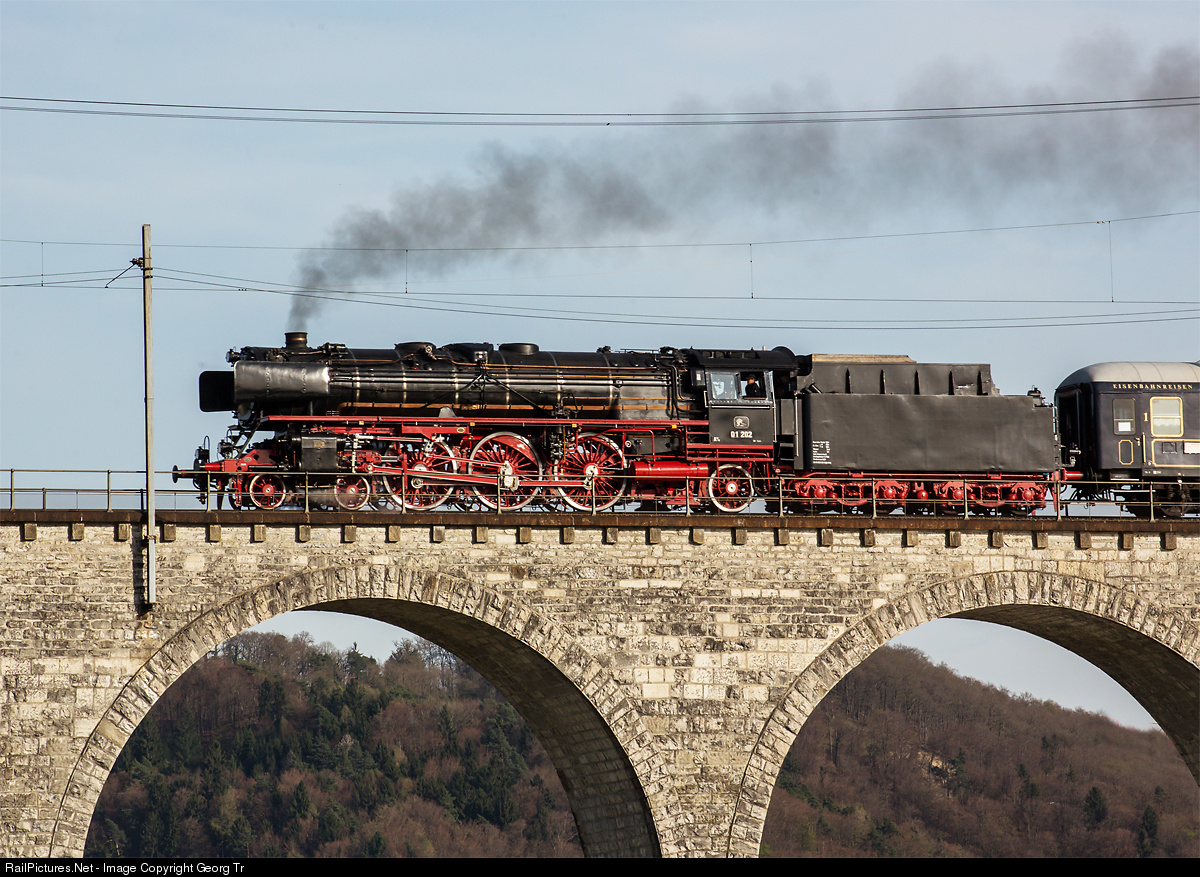 | Former german express train steamlocomotive "Pacific" 01 202 from Lyss is on the way to Dresden with a charter special. The train is just crossing the Rhine viaduct between Eglisau and Hüntwangen-Wil. |