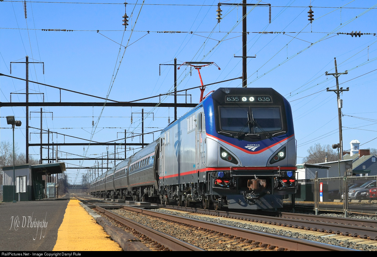 | Amtrak's newest ACS-64 to enter revenue service, #635, roars through Levittown, PA looking like a Ready-to-Run model train fresh out of the box......except for the bird splatter above the number board on the engineer's side. Guess we know who won that race! |