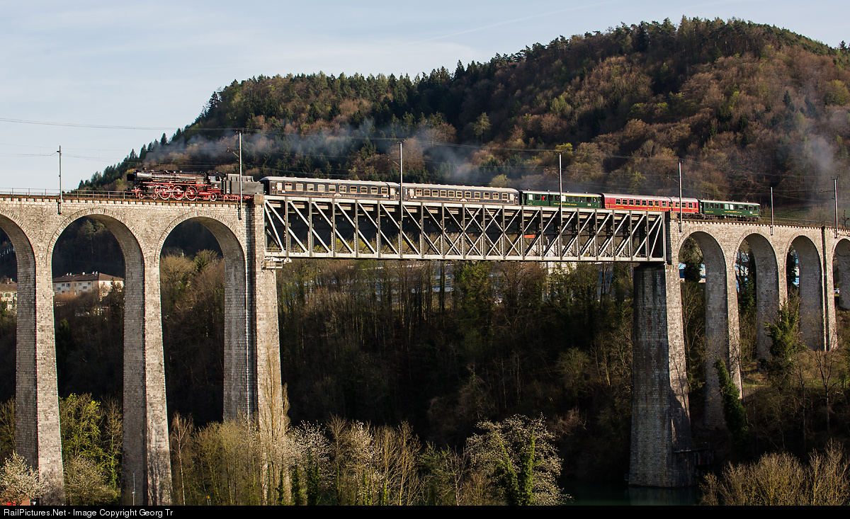 | The former german express train steamlocomotive 01 202 (4-6-0 Pacific) of the association "Pacific 01 202" in Lyss is on the way to the steam locomotive gathering in Dresden/Germany, with cars of DNV Touristik, Swiss Classic Train and a red dining car of the Haltinger Speisewagen Freunde. The train is crossing the Rhine viaduct between Eglisau and Hüntwangen-Wil. |
