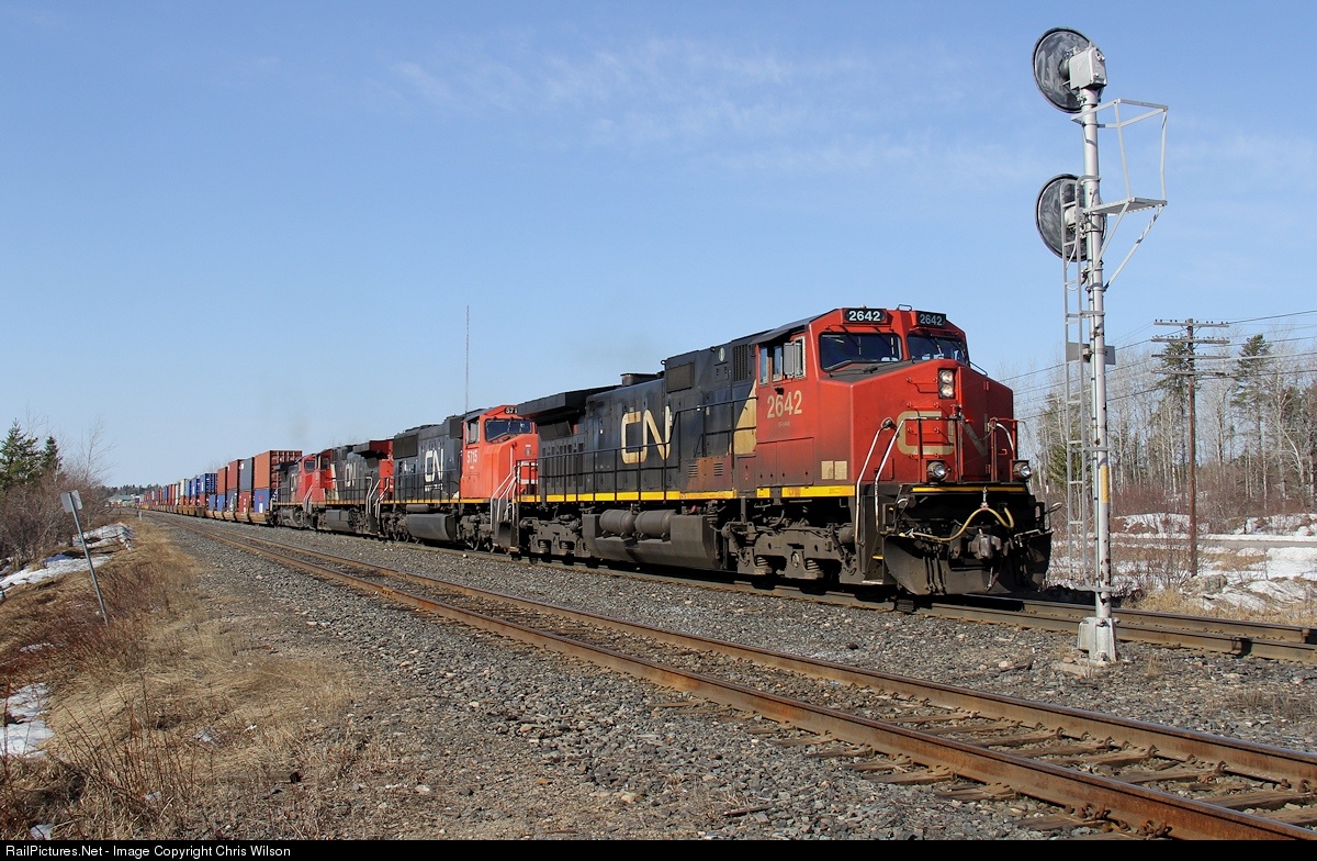 | CN X112 knocks down the light at Armstrong East with a long 173 platform intermodal ; CN 2642, 5715, 2561, 2153 provide the power |