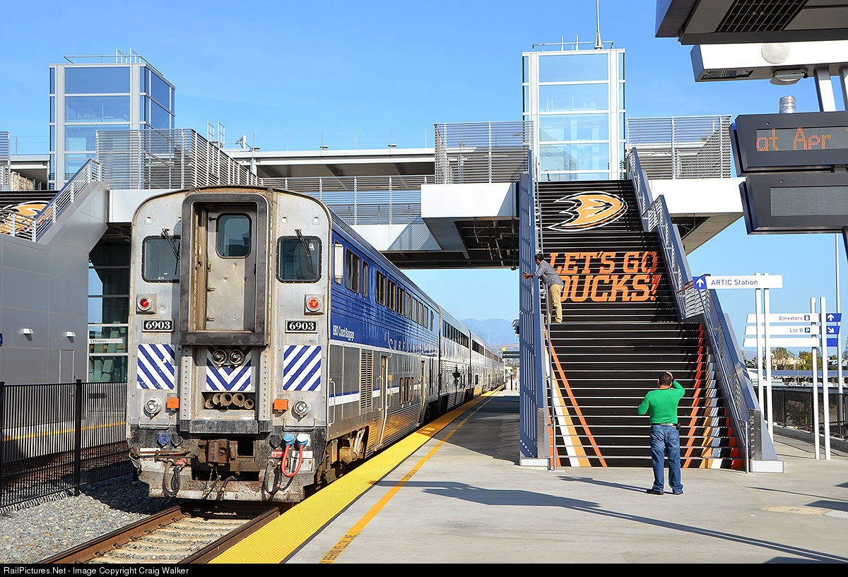 Let's Go Ducks! Amtrak Pacific Surfliner #582 departs Anaheim, California's, Regional Transportation Intermodal Center (ARTIC), heading to San Diego, on April 11th, 2015. The station's staircases have been decorated for the Anaheim Ducks hockey team, who play across the street and just clinched a playoff berth days before. (Sorry LA Kings fans ... Actually, no, I'm not!) And the station's lighting system illuminates in orange for Ducks' home games.