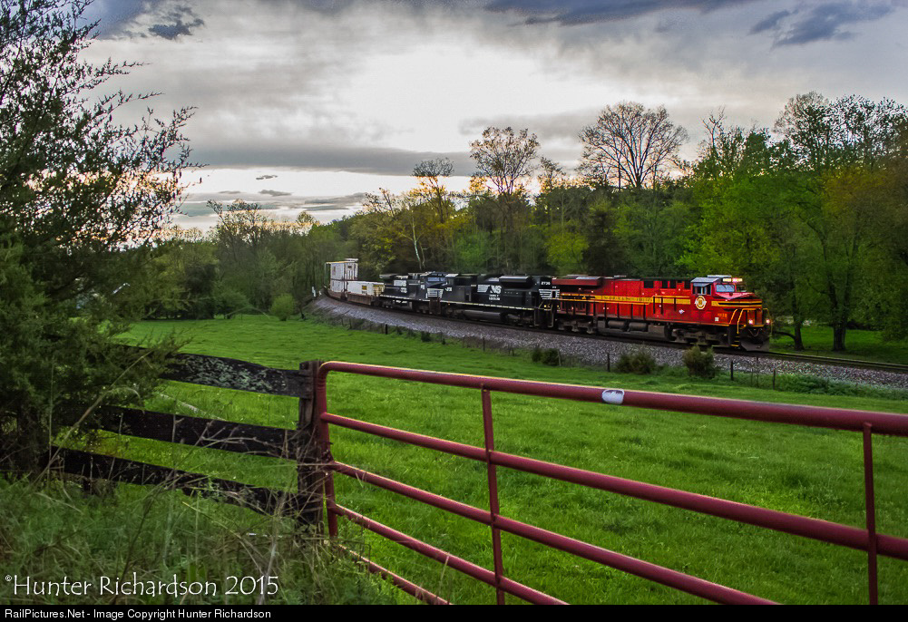 | As the sun sets on a beautiful Sunday afternoon, Norfolk Southern's 'Original NS' Heritage unit is at the helm of 202 as it weaves it's way into Telford, Tennessee. |