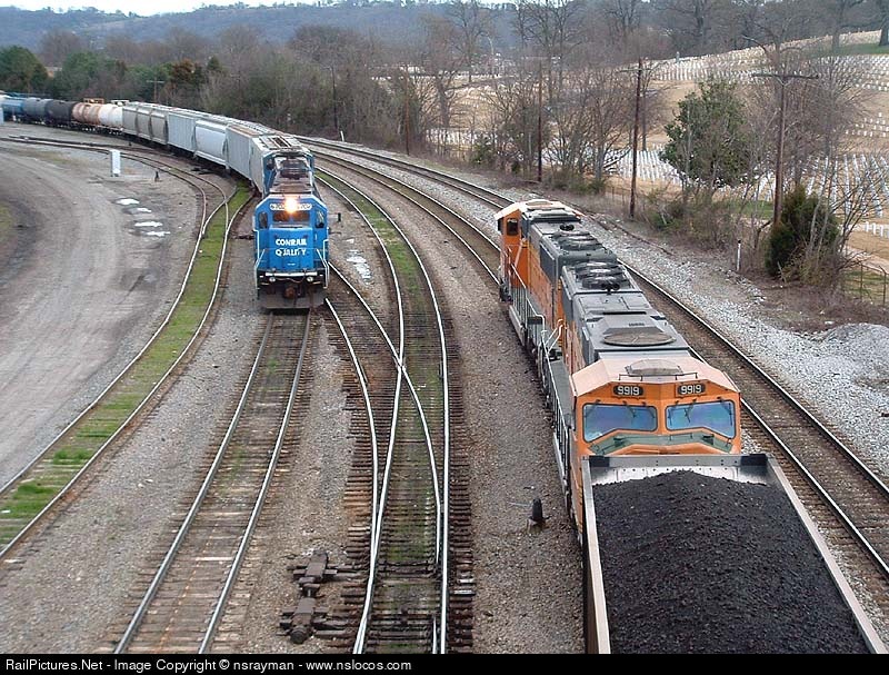 NS G38 with CR 6702 meets NS 734 with BNSF 9915 at east end.