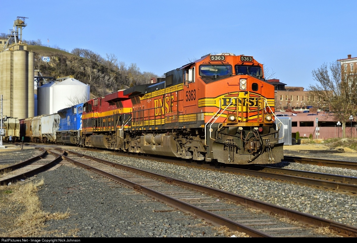 BNSF C44-9W #5363, KCS ES44AC #4797, and CITX SD9043MAC #118 provide power to a Westbound CP manifest as it passes the old Fleischman's Malting Company building in Red Wing, MN with Red Wing, MN's ADM plant and Barn Bluff in the background. Photo taken 4/17/15 near MP 370.71 on the CP River Sub.
