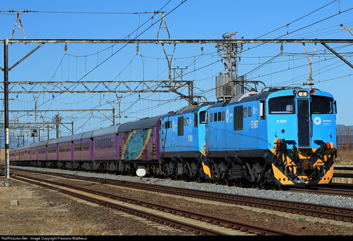 | These 6E1 locomotives are freshly painted to match the new color scheme of PRASA (Passenger Rail Agency of South Africa). Here they are on their maiden voyage hauling the Premiere Classe train service between Cape Town and Johannesburg. This train set will also be painted light blue soon. |