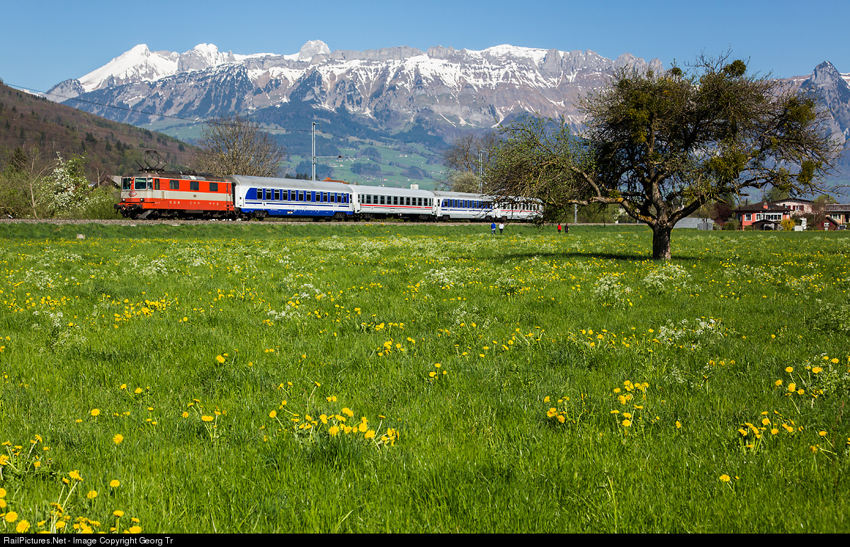 | Re 4/4 II # 11108 in "Swiss Express" livery is pulling the EuroNight 30464 from Beograd to Zürich, with sleeping, couchette and coach cars of the croatian HZ. |