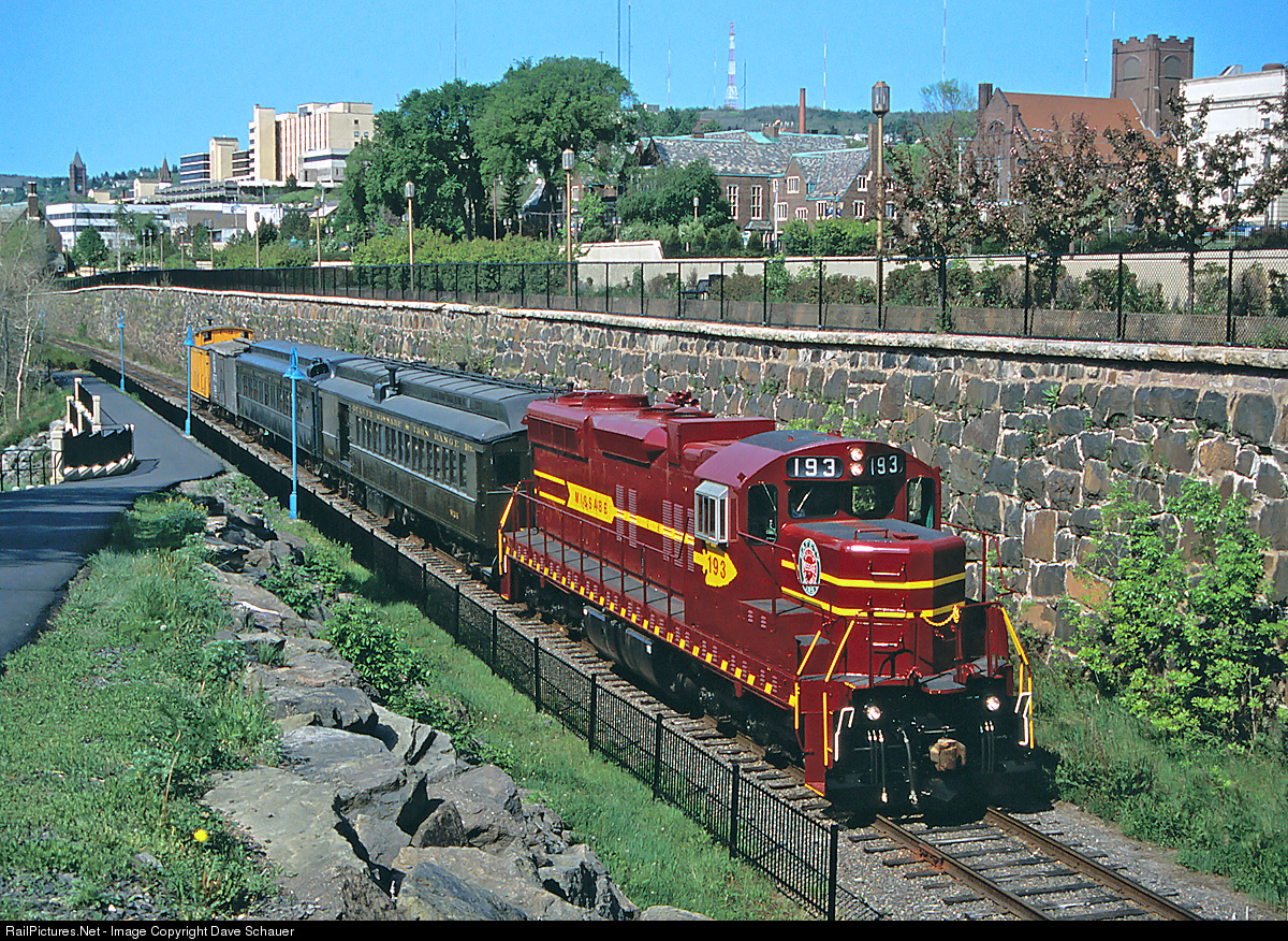 | Fresh from repainting at DM&IR's Proctor shop, SD18 193 leads a mixed train of Missabe equipment along the North Shore Scenic Railroad for members of the Missabe Railroad Historical Society. DM&IR donated the SD18 to the Lake Superior Railroad Museum and it is believed to be the last locomotive painted by the railroad before being absorbed by CN in 2004. |