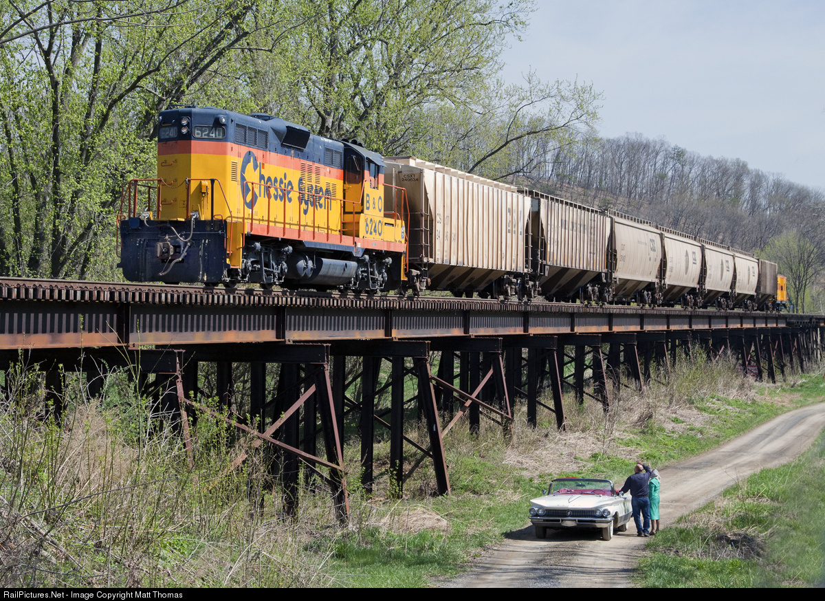 | Another great Chase Gunnoe photo charter which included a two day trip over the Potomic Eagle and a night photo secession. Here Chessie System GP-9 number 6240, bulit in August 1957 as Chesapeake & Ohio 6240, later Chessie 6240 runs south over the twin bridges and past a couple out for a drive in their 1960 Buick. |