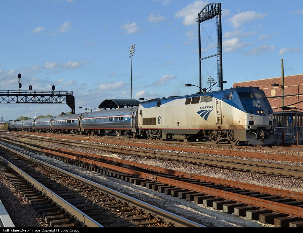 | Amtrak 61 arrives into Joliet with Lincoln Service 305. A 5th track has been laid and there will temporarily be five tracks through the station area until the permanent realignment of the tracks takes place. |