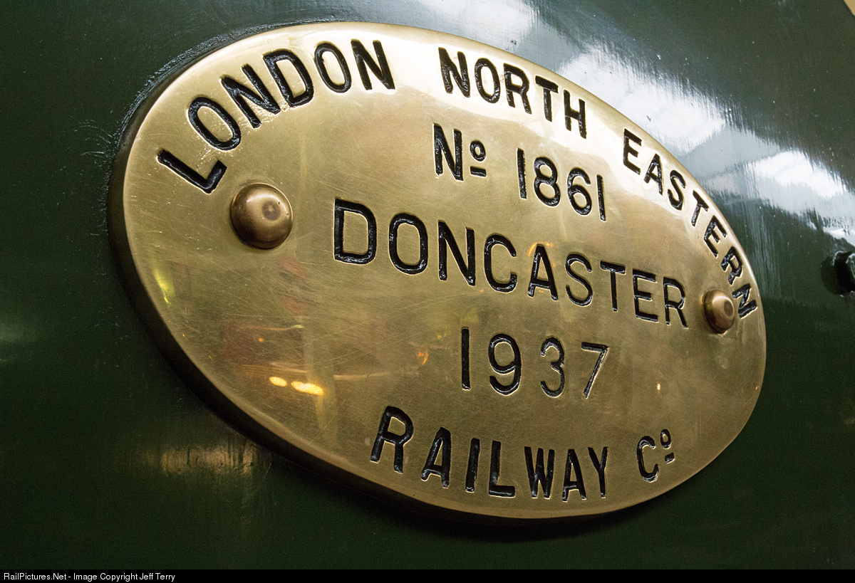 | Polished brass builders plate on Doncaster-built A4 Dwight D Eisenhower, displayed at the National Railroad Museum, Green Bay, Wisconsin. |