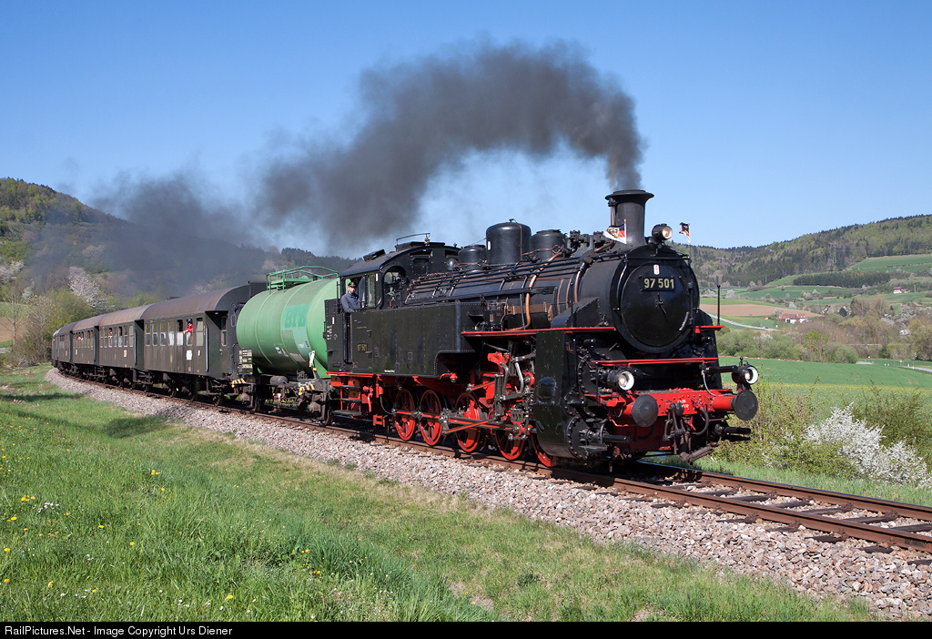 | Cog wheel steamlocomotive 97 501, operated by the "Freunde der Zahnradbahn Honau-Lichtenstein" (Friends of the cogwheel railway from Honau to Lichtenstein), on the way to Zollhaus-Blumberg on the heritage railway „Sauschwänzlebahn“. |