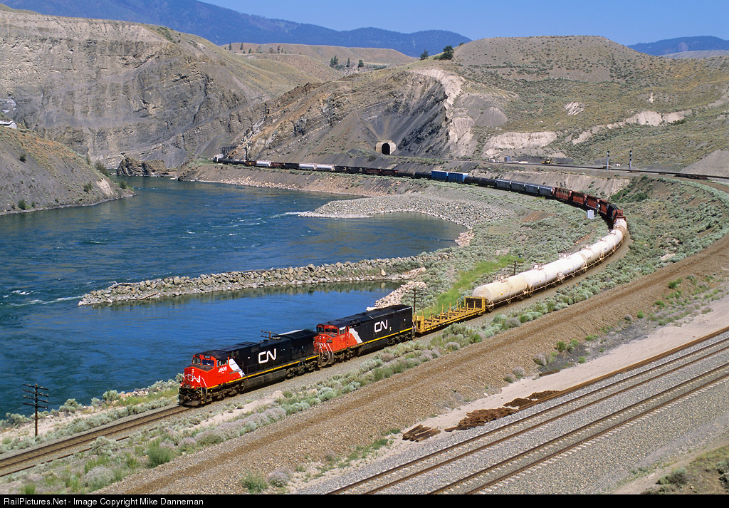 Canadian National GE C44-9W No. 2606 and GE C40-8M cowl No. 2430 lead a westbound freight passing through Black Canyon west of Ashcroft, British Columbia, on the morning of June 25, 2006. In the foreground is Canadian Pacific’s parallel main line and the beginning of double track to Basque, while the tunnel visible above the train is CP’s Black Canyon Tunnel.
