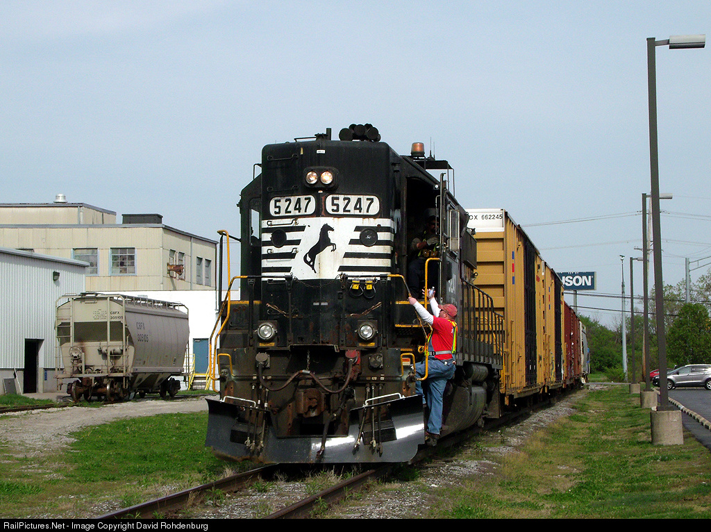 After doing a quick walkaround of their train after coming on duty, the Conductor has taken his seat in the cab, and the Engineer climbs aboard veteran Norfolk Southern high hood 5247, a GP38-2 built for the Southern Railway in August of 1979, as they prepare to begin switching the Continental Mineral facility.