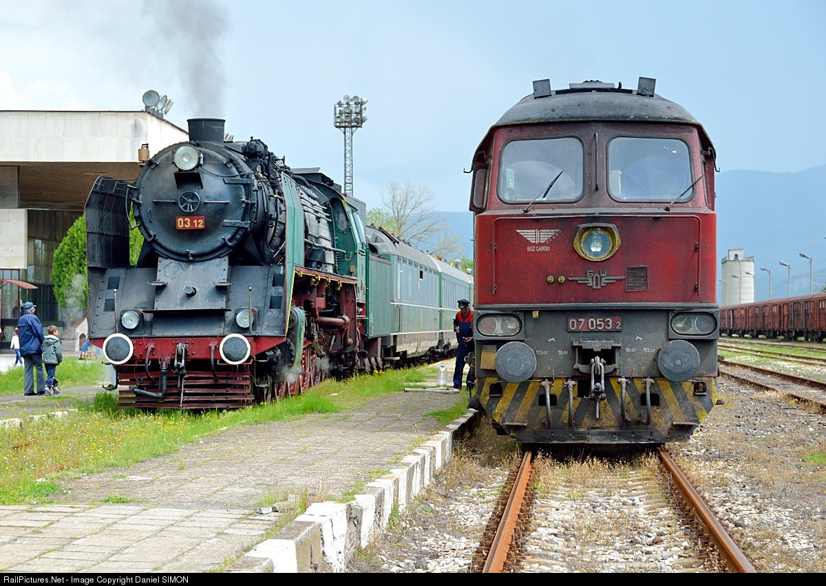 The 03-12 is making a short stop at the Kardzhali station before heading on for Momchilgrad. The diesel locomotive of the BDZ class 07 is a Ludmila. Similar engines can still be seen in service in Germany (DB class 232 ex DR class 132).