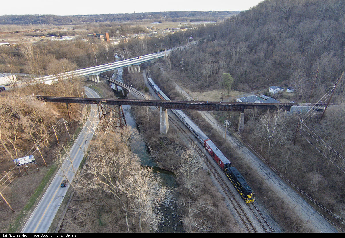The Cincinnati Dinner Train is seen passing under the former N&W trestle in Fairfax. This location is known by the railroad as CP Valley. The lower track leading off to the left runs towards Clare Yard in Marimont as well as Norfolk Southern’s former Cincinnati District to Portsmouth, Ohio. The line is only open to Winchester and is now operated by the Cincinnati East Terminal Railway (CCET). The Dinner train is shoving onto Indiana & Ohio’s Oasis Secondary which is also now a stub in track. It ends near the Montgomery Inn Boathouse just east of downtown Cincinnati. The trestle has not seen any traffic since the only customer in Norwood closed in August of 2009. A group is working to purchase the line from Norfolk Southern and turn it into a bike trail. Shot from a DJI Phantom 2 Vision + drone. The Cincinnati Dinner train operates nearly every Saturday evening from mid March through December. For more information visit http://www.cincinnatirailway.com/dinnertrain/
