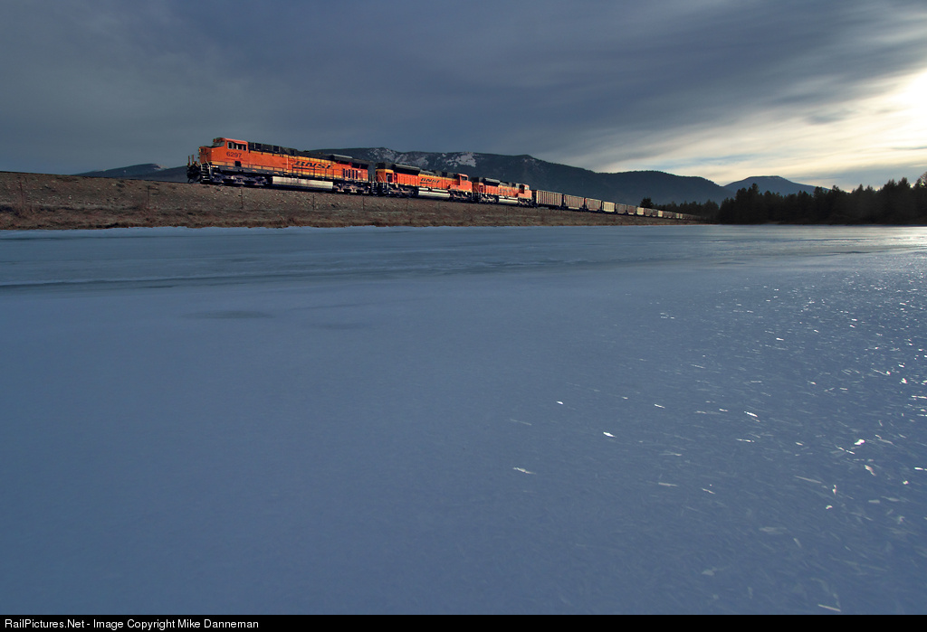 | After sunrise, a westbound BNSF coal train passes an icy Frog Pond west of Trout Creek, Montana, on February 24, 2015. |