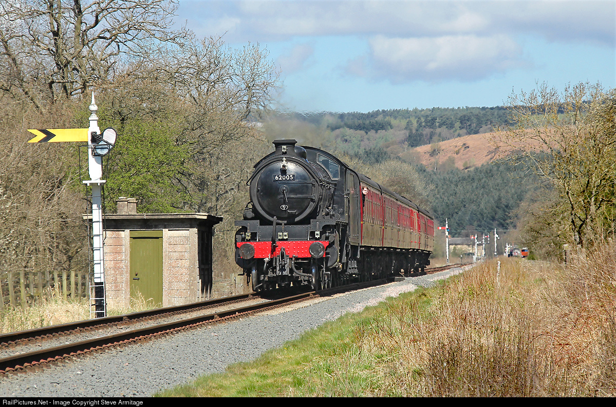| Whilst photographers usually prefer some indication that a locomotive is working hard, good driving and firing skills are well in evidence here. 62005 has left Levisham Station, seen in the far distance. She is indeed working hard, but the only hint is a faint heat haze above the chimney. The surrounding forest is tinder dry and good working practice ensures that errant cinders or sparks can cause no fires. |