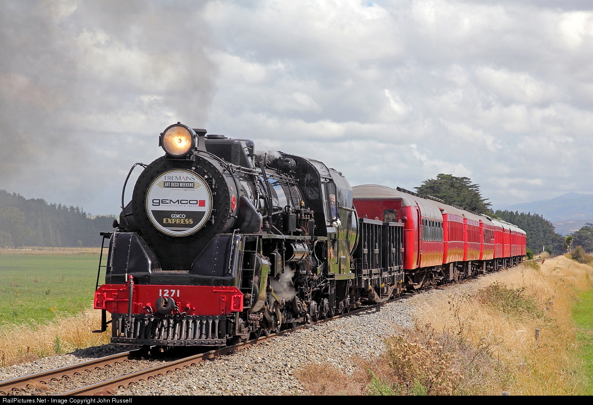 | 1271 steams north of Woodville with Steam Incorporated excursion train bound for Napier. The train is a feature of the annual Art Deco Weekend celebrating the architectural style Napier was rebuilt in during the 1930s. The locomotive was one of the last built in NZ (1946 at Hillside, Dunedin.) |
