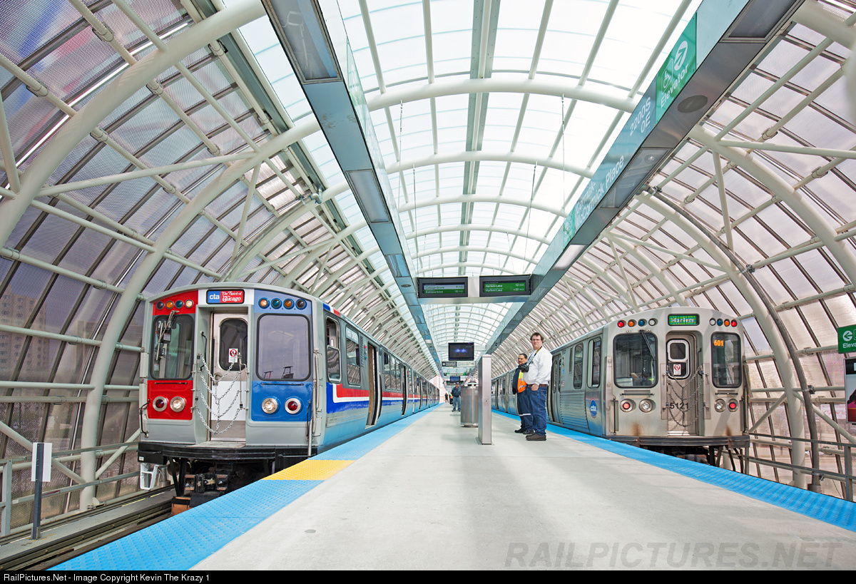Introduced in 1976, a four car train of 2400 series Boeing-Vertol rail cars is seen in their original bicentennial paint at the new Cermak-McCormick Green Line station. The cars were retired in 2014, but eight cars were kept and painted for a "historical fleet" to use for special events and charters. On the right is your typical boring green line train.