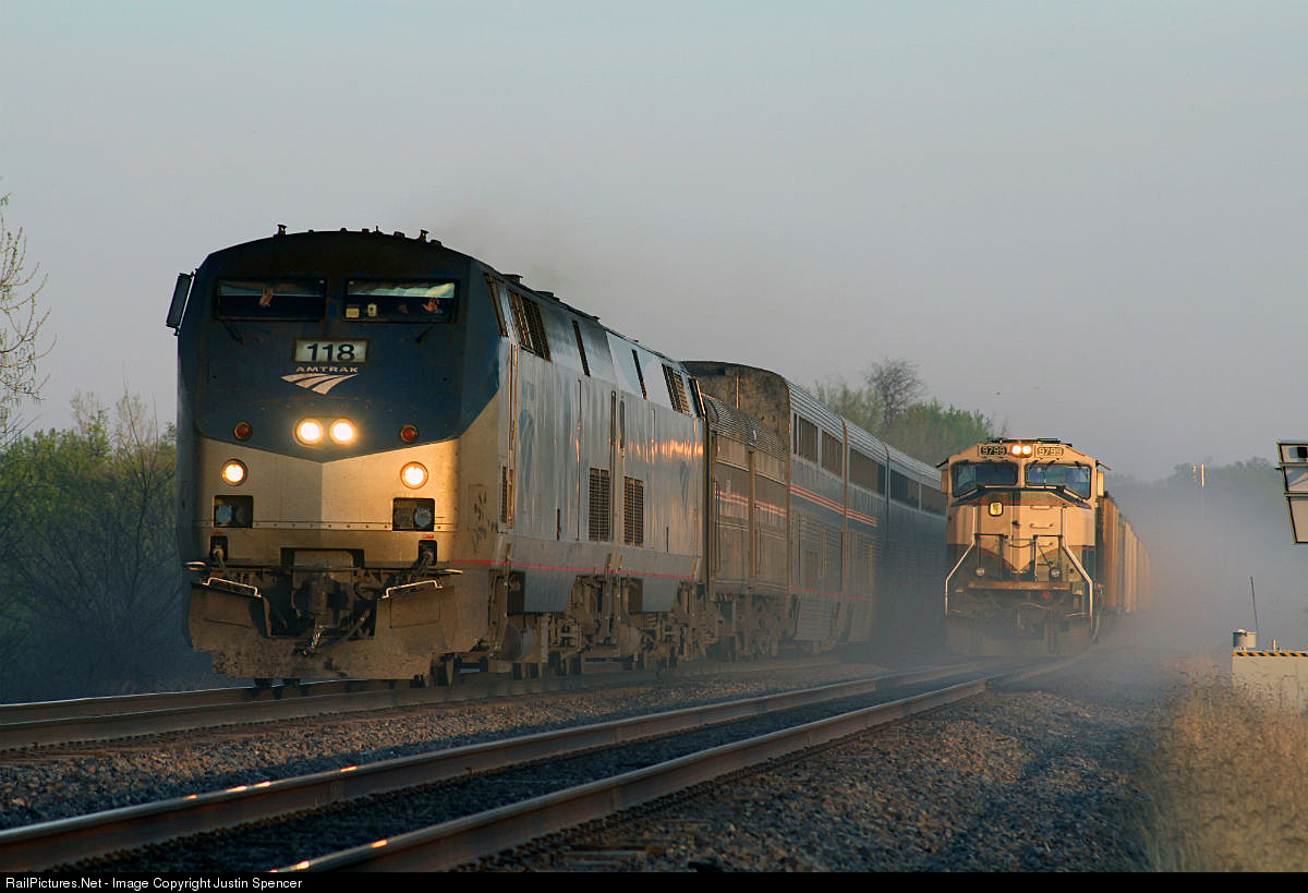 | Amtrak 118 leads the westbound California Zephyr through the low lying dust of a gravel road as the crew gives my camera some waves. Chillicothe, IA on the BNSF Ottumwa Subdivision. |