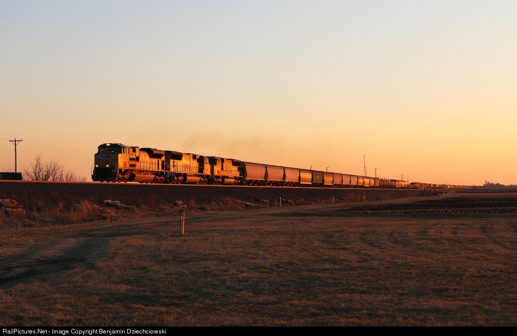 UP SD70ACe #8507 leads MMCPR past Global III at sunset as it enters the city of Rochelle, en route to Proviso.
