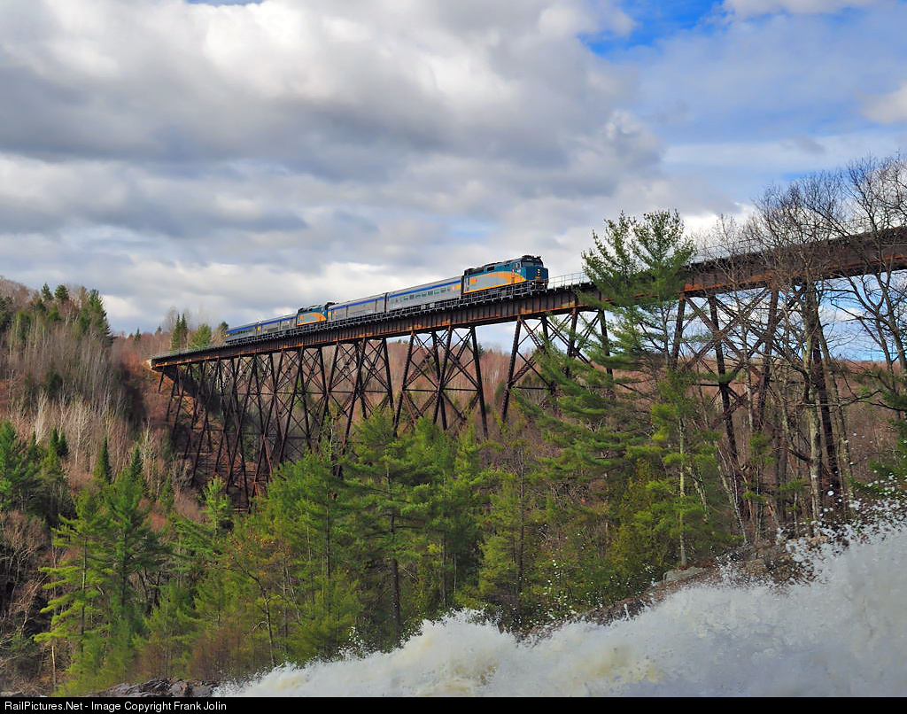 As spring run off flows, combined VIA Rail Abitibi/Saguenay 601 is crossing over the spectacular bridge at St Ursule.
