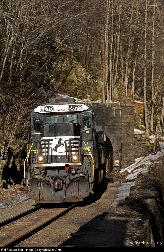| Sunglasses were a must for the crew of 14T-12 as they run straight into a wall of sun, exiting the east portal of the 4.75 mile long Hoosac Tunnel at 8:13AM on a beautiful Sunday morning in Western Massachusetts. The "spots" on the cab of the NS 8870 are none other than water droplets, resulting from the melting snow atop the tunnel portal. |