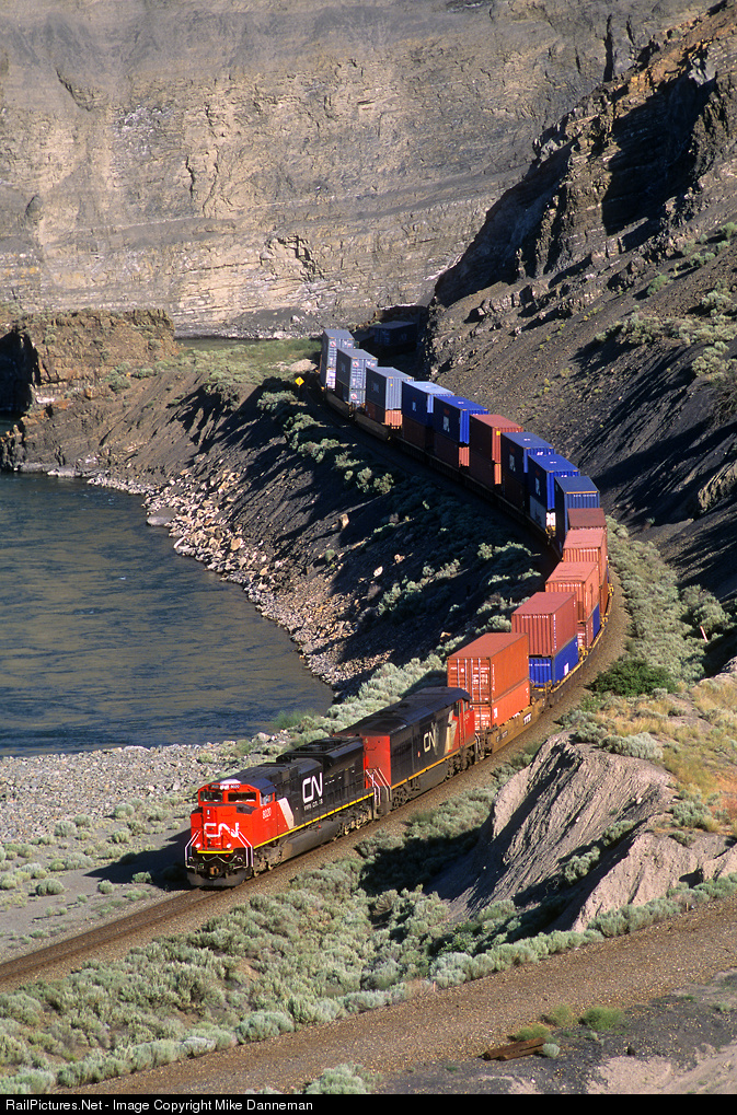 A Canadian National intermodal train snakes through Black Canyon west of Ashcroft, British Columbia, on June 25, 2006. Powering the westbound train is EMD SD70M-2 No. 8020 and GE C40-8M No. 2454.