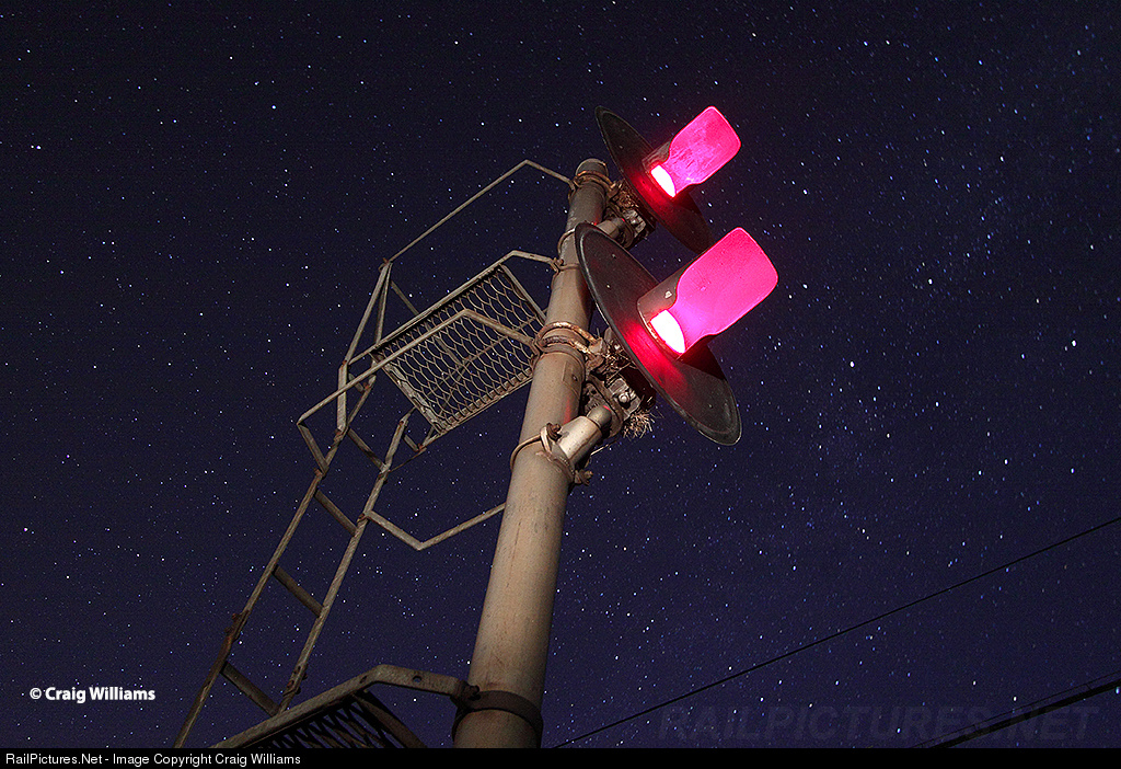 | Under a star filled night, the westbound absolute signals at Crawford are all red. Traffic is somewhat quiet in the early morning hours here. This is the north end of a short single track section over the Wisconsin River between CTC Ports and CTC Crawford. The BNSF signal gang is working on installing CTC along this route, so classic signals like these are in jeopardy. |