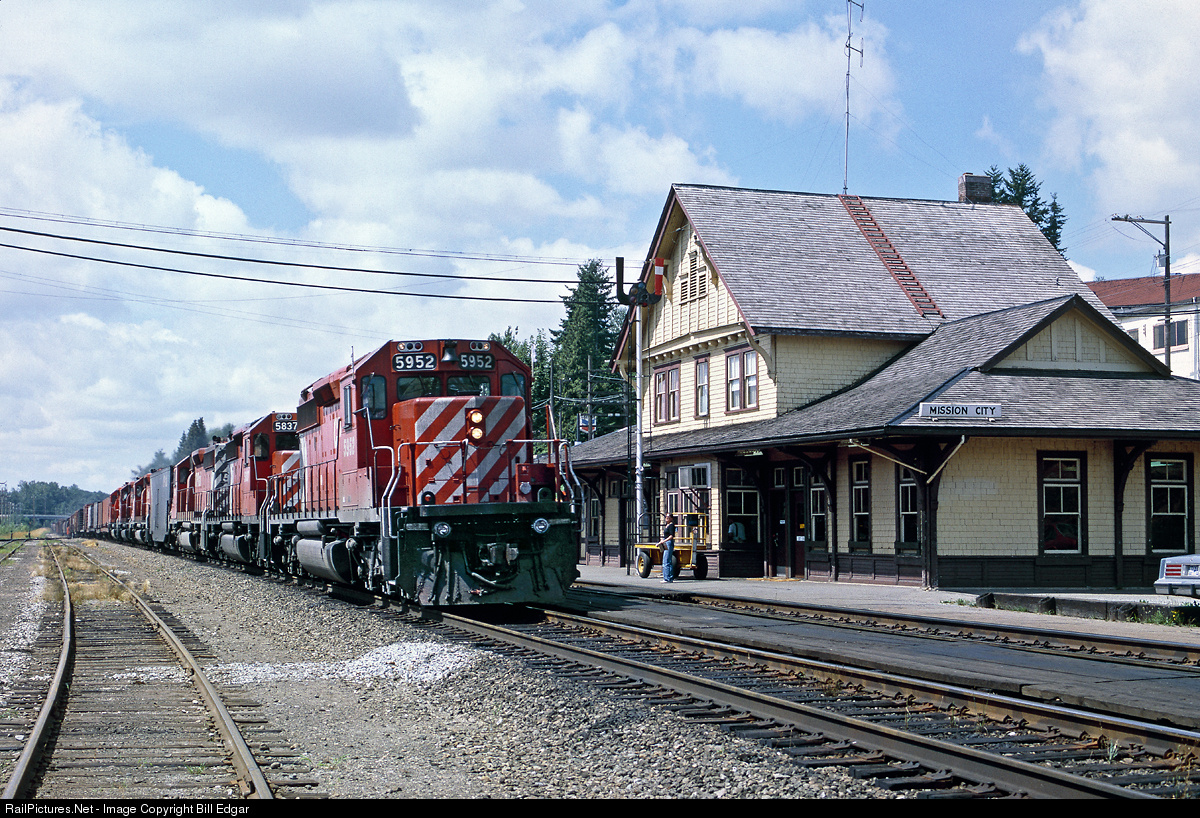 | CP 5952 makes a quick stop at Mission City, BC while the crew checks in at the station. This manifest freight is eastbound out of Coquitlam, BC (Vancouver) headed for the Fraser Canyon, and the consist includes a radio control car and mid-train power deadheading back to eastern British Columbia to handle heavy westbound trains over Kicking Horse and/or Rogers Passes. |