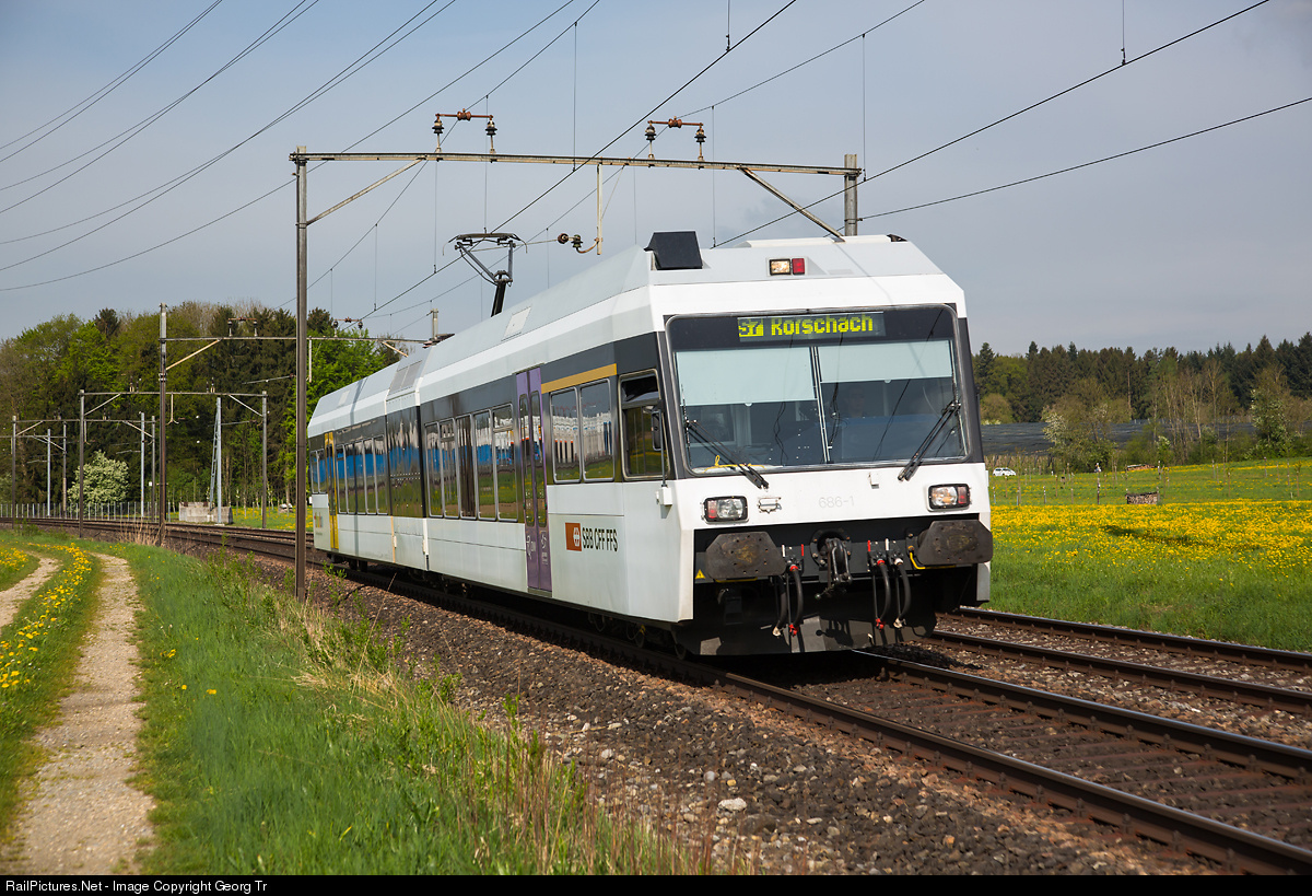 | Articulated lowfloor regional train "GTW first generation" RABe 526 686 of the Thurbo as "S 7" 23737 from Weinfelden via Romanshorn to Rorschach between Erlen and Oberaach, running on the right instead of the left track, because of track work between Sulgen and Erlen. The ten RABe of the 526.68. series were built by Stadler Rail in Bussnang between 1998 and 1999 for the Mittel-Thurgau-Bahn (MThB). |