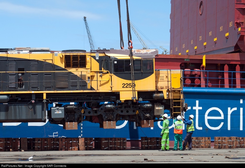 Day 3 of off loading! Ex Queensland Railway, 2250 Class, No. 2259. Transnet Freight Rail imported 34 ex Queensland Railway locomotives. They arrived in Durban on the BBC Ohio and off loading began Friday, 17th October 2014. It is believed that 20 of the locomotives are for Transnet Engineering (the manufacturing and engineering division of Transnet Freight Rail). These 20 will then be marketed to other African countries (possibly the 20 X 2250 Class?). The remaining 14 (possibly the 14 X 2170 Class?) will be retained by TFR and deployed to work on the line between Bethlehem and Kroonstad. Some info on the 2250 Class off Wikipedia (the free online encyclopaedia) - “The 2250 Class are a class of diesel locomotives rebuilt by Queensland Rail's Redbank Workshops in 2004. The 2250 Class are former 1550, 2100, 2130, and 2141 Class locomotives that were rebuilt in 2004. The rebuilds included new cabs, Dash 2 electronics, ZTR traction control equipment, EMD 645E engines from 1502s and the replacement of the roots blower supercharger with a turbocharger. They were also ballasted to 110 tonnes (110 long tons; 120 short tons) as they only operate on heavy coal trains. 20 locomotives were sold to Transnet in South Africa in 2014.”