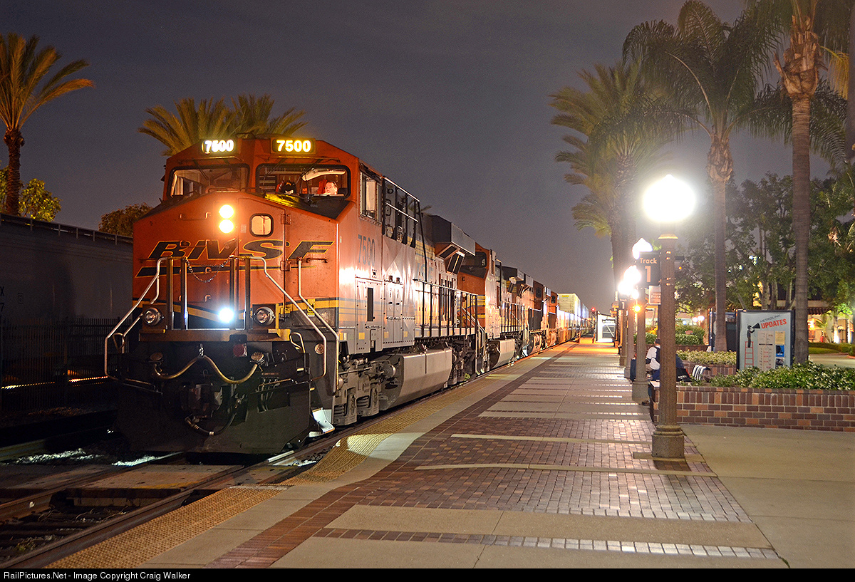BNSF Railway's hot Z-LACATG7-30 train (Priority UPS-LTL Intermodal; Los Angeles CA to Atlanta GA) sits and waits in front of the Fullerton, California, passenger station at 10:30 pm on April 30th, 2015. This train, with 7500, 4578, 6721 and 6879 for power, is stuck waiting for train R-CAL0063-30A, which consists of two locomotives (including Santa Fe 4-8-4 3751) destined for display at the upcoming weekend's Fullerton Railroad Days. Unfortunately, because of a broken turnout, the R-CAL0063-30A is blocking Main 1, and the dispatcher is most likely pulling his hair out due to the delay of a high priority intermodal train.