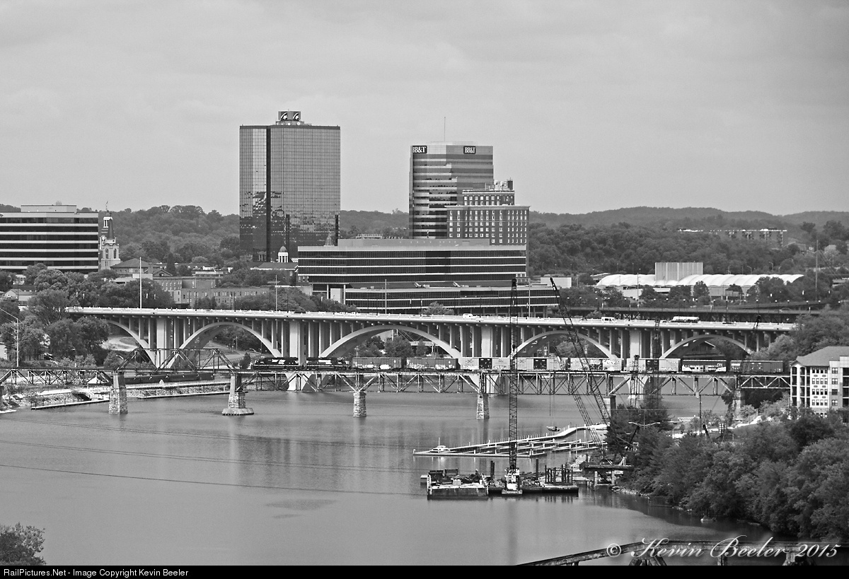 NS T21, the "K&A Local" is seen crossing the Tennessee River returning to downtown after performing it's work south of Knoxville. T21 is a turn that runs from Sevier Yard to the Maryville/Alcoa area and back. It services several industries along that route, including the Co-Op in Rockford, and the Alcoa Plant. These rails run through the 1982 World's Fair Site, and run past the famed L&N Depot near downtown that still stands. This line was purchased back in the late 1800s by the Knoxville and Augusta railroad, which would eventually end up being absorbed into the Southern, and subsequently, NS. Somehow, the K&A name has held on all these years, and is still used by NS to this day. In fact, the point where these rails join back up with the NS West End District at downtown is called "K&A Junction" by NS.