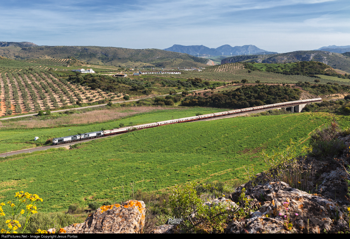 Eastbound Al Andalus touristic train is approaching Campillos station to meet with a Talgo Madrid-Algeciras.