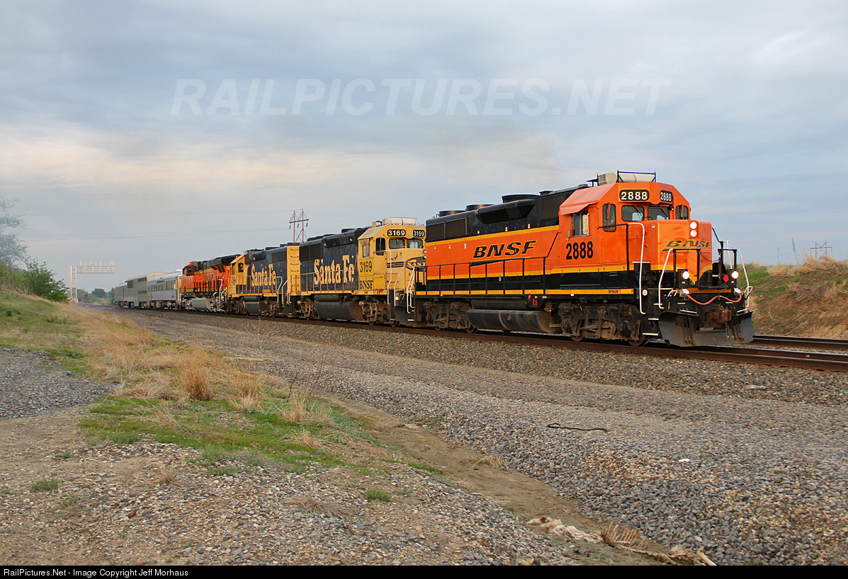 | Is this an odd consist or what? BNSF 2888 leads the rest of the Cement City local power and BNSF's display train with BNSF 8175 and three passenger cars back west towards KC at Marceline, Missouri. BNSF 8175 was on display for Marceline's 4th Annual Model Train Show that the city puts on that BNSF helps out with. Locomotives: BNSF 2888, BNSF 3169, BNSF 2848 and BNSF 8175