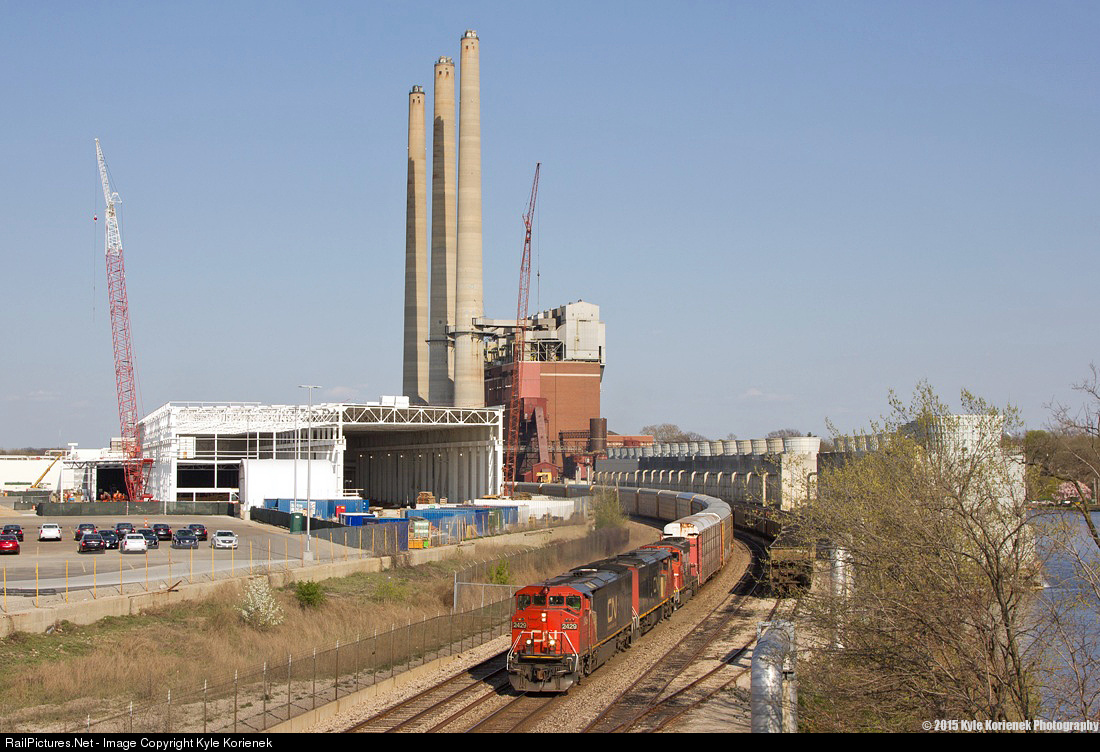 With pressure from legislators to produce cleaner energy, coal has started to see its end in some places, one of which: Lansing, MI. A victim of this is the Otto E. Eckert Station. Operated by the Lansing Board Of Water & Light, the plant which has been in operation since 1923, is scheduled to be decommissioned by 2025 in favor of the newer natural gas plant that is currently in operation already. However, on the other side of the tracks, growth is taking place with the expansion of the Lansing Grand River assembly plant which produces the Cadillac CTS & ATS, and will soon be producing the Chevrolet Camaro, which is the reason for the expansion. Despite all of this change, one thing remains constant: a steady flow of CN trains rolling right through the heart of it all. CN A451 takes the honors for the moment as they roll west with a long train of racks and mixed freight.