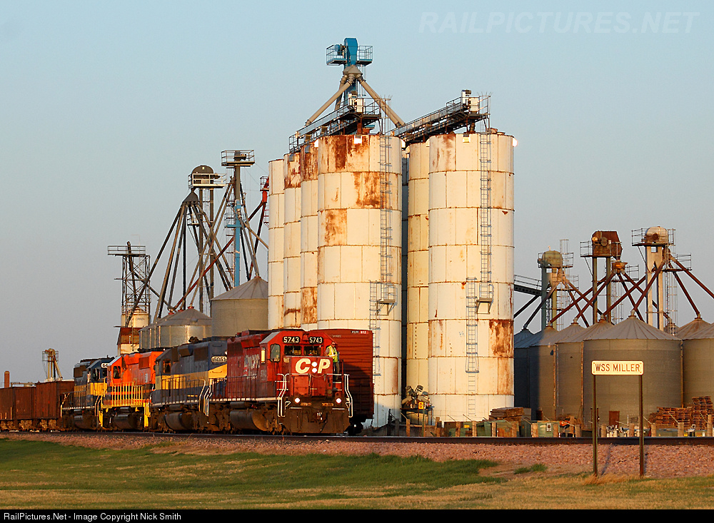| CP 5743 is on the point RCPE's Huron-Rapid City freight in the siding at Miller after meeting the MRCHU. Once lined out, the train will highball west toward the State Capital city of Pierre. |