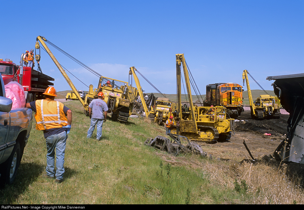 Crews from Hulcher and R.J. Corman unload more track panels with side boom caterpillars at a wreck site at Lakeside, Nebraska, on BNSF’s Sand Hills Subdivision. The derailment happened on May 17, 2006, when an eastbound BNSF coal train led by No. 8814 ran an intermediate signal with a red aspect and plowed into the rear of another coal load, with obvious results. The trailing locomotive of the train, along with a rear DPU on the train hit, were also damaged, along with seven hoppers that also derailed and were destroyed.