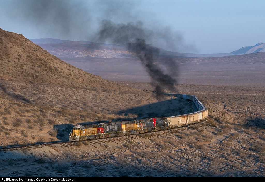 An ailing turbo has this aging set of Trona Railway EMDs down to a crawl, as they lug their train loaded with soda ash toward Searles.