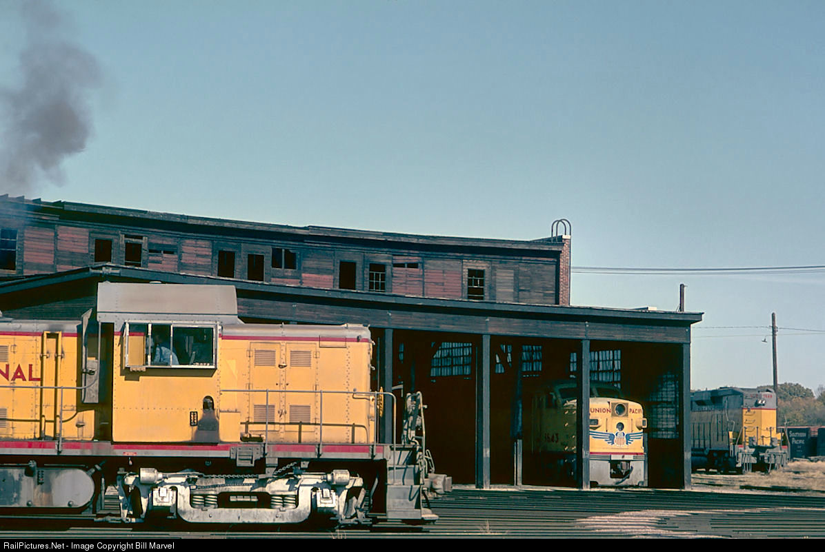 A puff of smoke indicates that former Spokane International RS-1 1221 has come to life at Union Pacific’s Marysville, Kansas, roundhouse, ready for afternoon switching chores. The stalls once sheltered 2-10-2’s and 4-12-2’s, but by this unseasonably warm afternoon, October 13, 1965, the road switcher’s only company is another Alco, FA-1 1643, last used to push freights west out of town and now earmarked for trade-in to EMD. The 1221 was built as Spokane International 210 in 1953, acquired when UP took control of SI in 1958, repainted in 1962, and, along with 11 other SI units, is assigned to UP lines east.