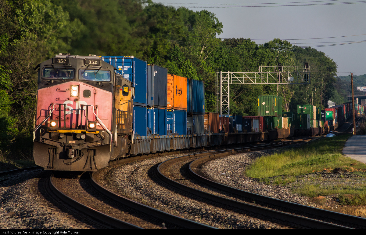 | Norfolk Southern intermodal train 22N (Memphis,TN - Atlanta,GA) highballs through Austell at dawn with a Southern Pacific AC4400CW on the point. |