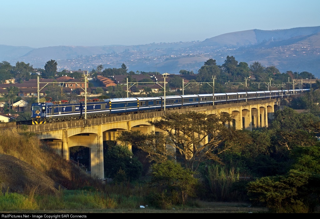 Sunrise and a first for us Natalians to see the two specially designated Blue Train Class 20E locomotives, who look stunning in this livery! Section Manager and senior Umbilo Depot driver, Mr. Chris Schutte, is in charge of 20 032 and 20 031, as they cross the Pentrich Viaduct in Petermaritzburg with the Blue Train. The train is heading for Durban for the weekend where it will be involved in the 2015 Tourism Indaba (Convention).