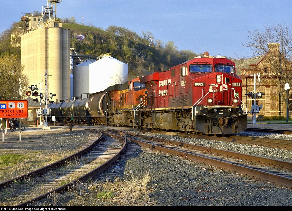 | CP ES44AC #8862 and BNSF ES44C4 #8235 provide power to CP Train Number 581 as it passes the Red Wing, MN Amtrak depot about a half hour before sunset. Photo taken 4/28/15 near MP 370.71 on the CP River Sub. The Red Wing, MN Amtrak depot is in the background. |