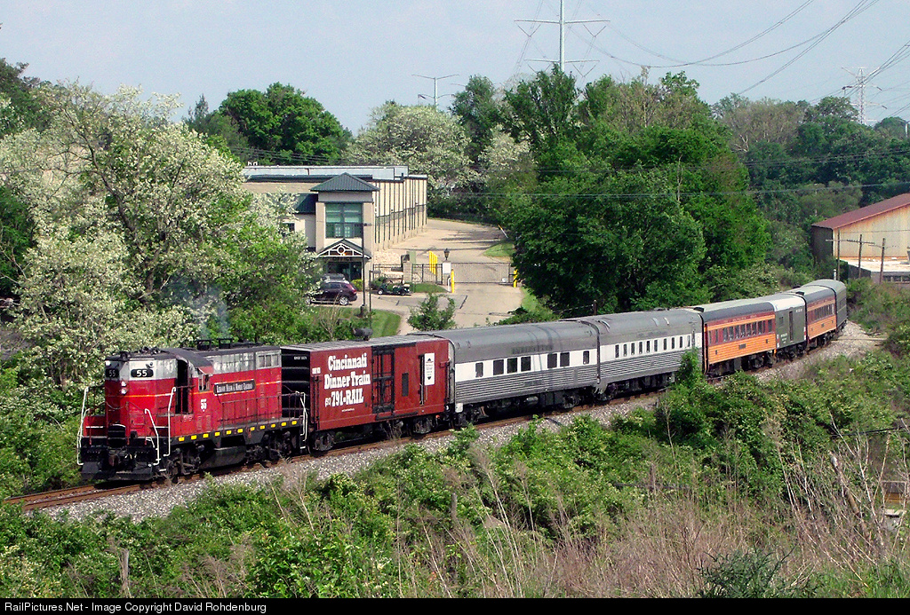 | The National Train Day 2015 edition of the Cincinnati Dinner Train shoves backwards to its boarding location at the former BBQ Revue Restaurant in Madisonville. For more information on the Cincinnati Railway and all of their operations, including the Cincinnati Dinner Train, please visit their website at www.cincinnatirailway.com. |