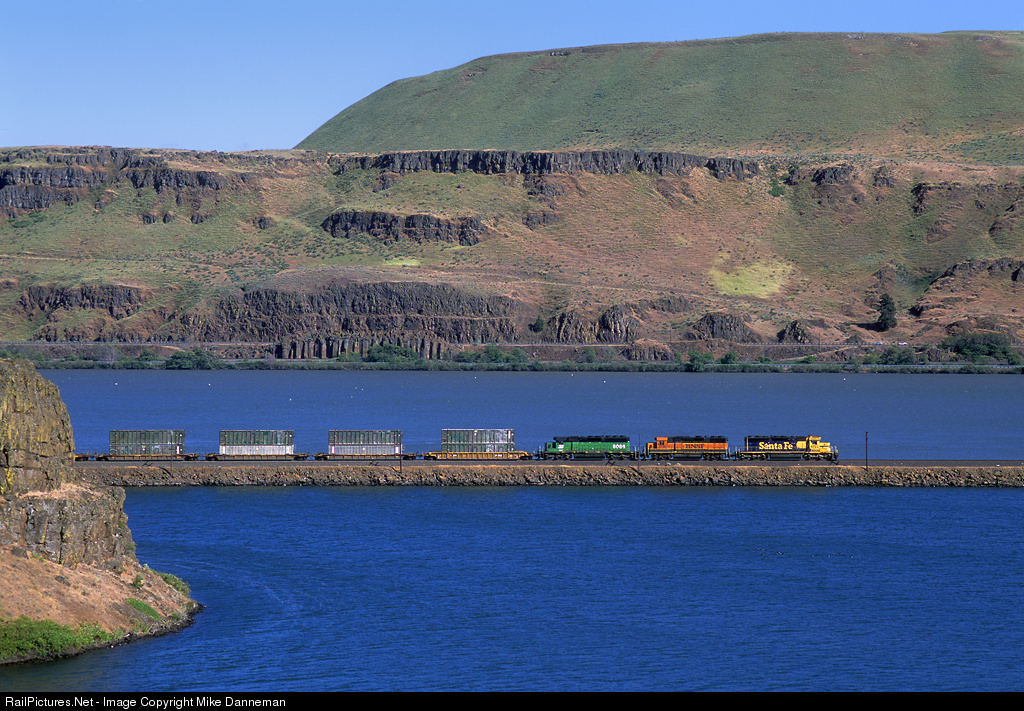 Looking like a westbound intermodal, a BNSF garbage train crosses the fill at Horsethief Lake near Wishram, Washington, on May 30, 2008. Power for the train is all EMD; two SD40-2s in Santa Fe and Burlington Northern paint, bracketing a GP39-2 in “Heritage I” colors.